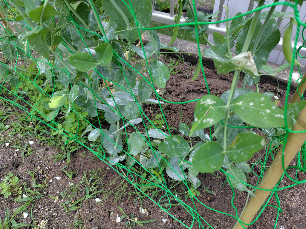 6月2日 全体が黄色く枯れる株が出現。成長が完全に止まり撤収です。他の株でも白い葉が急増、枯れる株も増え出して、6月15日、遂に完全撤収となりました。初めてのスナップエンドウは約2ヶ月の短命に終わりました(T_T)