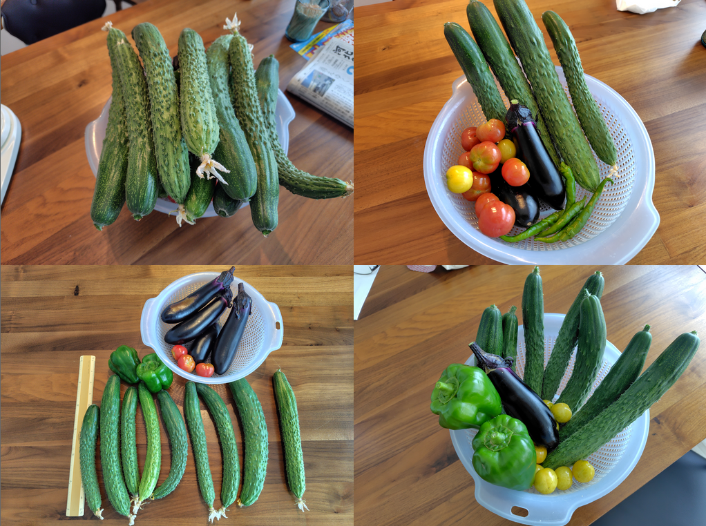 収穫写真。1株しか植えてないのに食べきれない収穫でした。冷蔵庫の野菜庫には常にキュウリのストックがあり、気を緩めて消費をしないとストックが膨張する状態💦 キュウリ地獄?