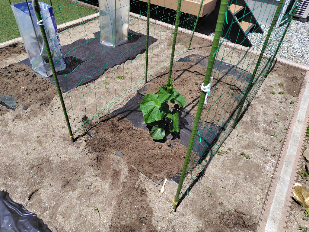 他の夏野菜と同じく4月30日に苗購入して5月1日植え付けです。マルチを貼った畝に植えて行灯で風よけ防寒も同じ。