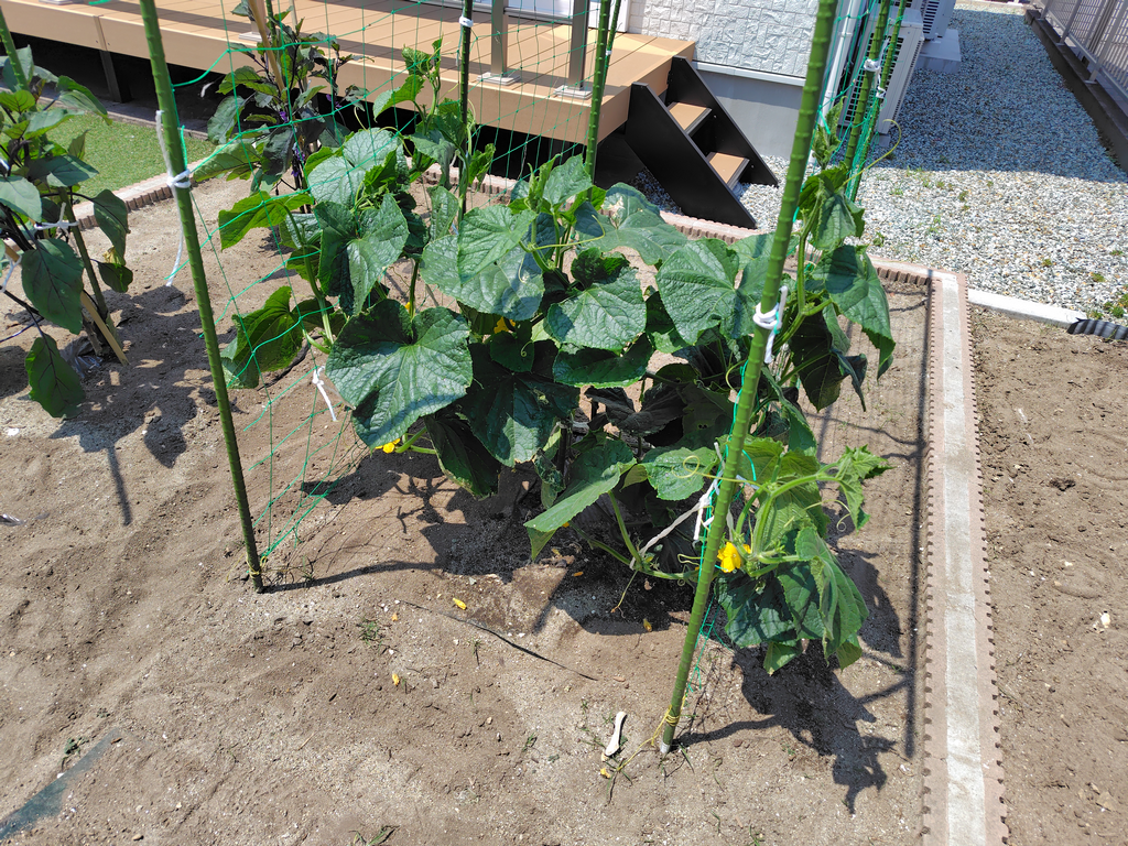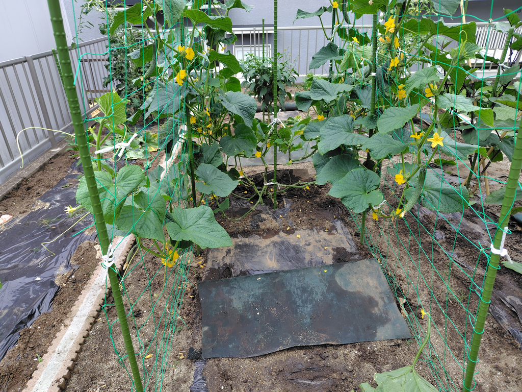 6月15日 誘引せず、伸びたツルを支柱で支えるやり方のため、ゴチャゴチャになっています…。キュウリは親ヅルを摘芯せず大事に伸ばし続けるのが長く収穫するために必要なのですが、ゴチャゴチャするとどれが親ヅルか分からなくなるので、1本仕立てや3本仕立てなど、プロの技に倣った管理が良いですね。