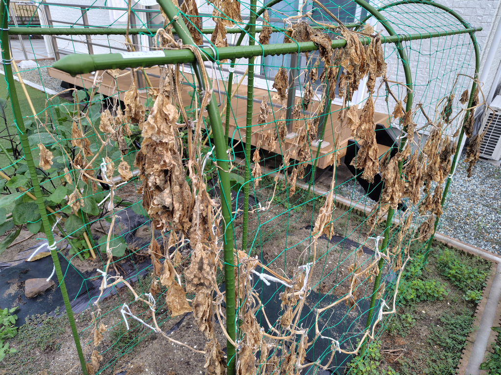8月29日 全体に枯れてきて収穫も減少。8月16日に最後の1本を収穫して2024年を終了しました。1株栽培で171本です。ナスやミニトマトが旺盛なのに対し、終了が早い気もしましたが大収穫ですし「キュウリ地獄」を十分楽しませてくれました^^