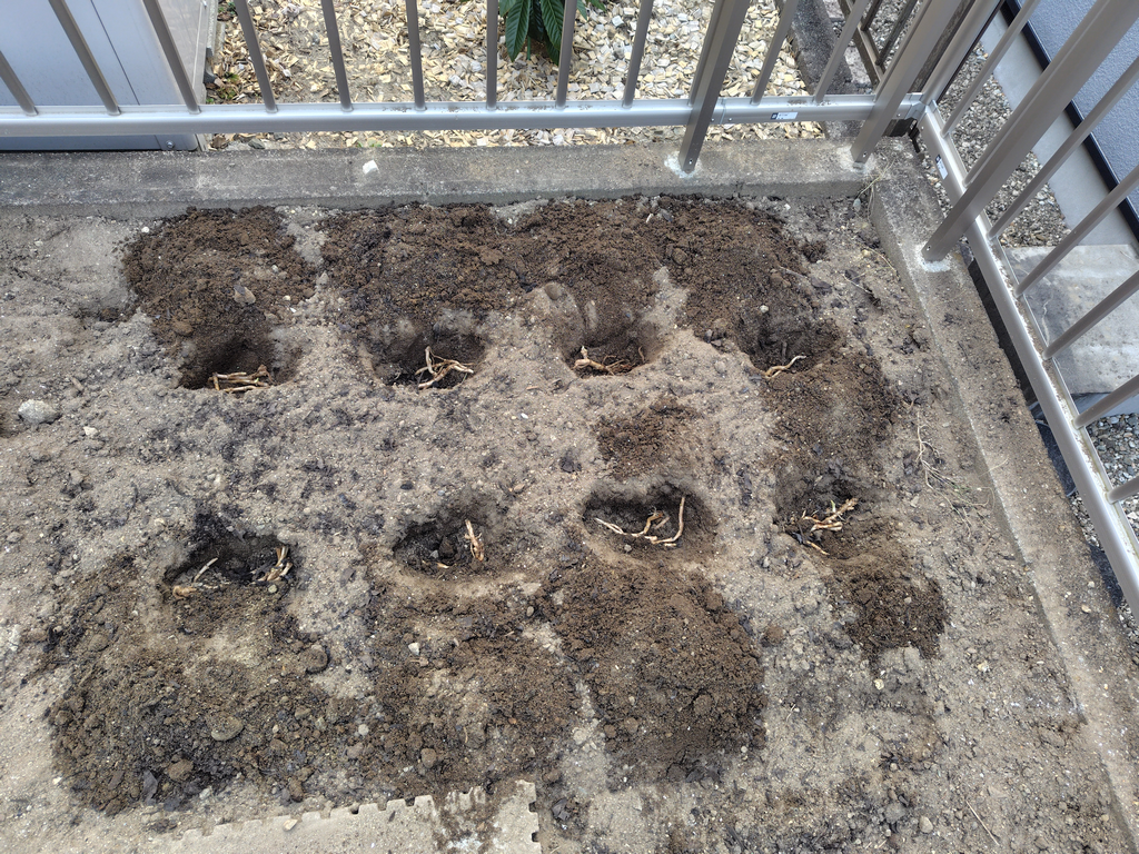 15~20cm間隔で深さ10cmほどの穴を掘り、種となる根を置き、土を10cm覆被。たっぷり散水して終了。全て教科書通りです。