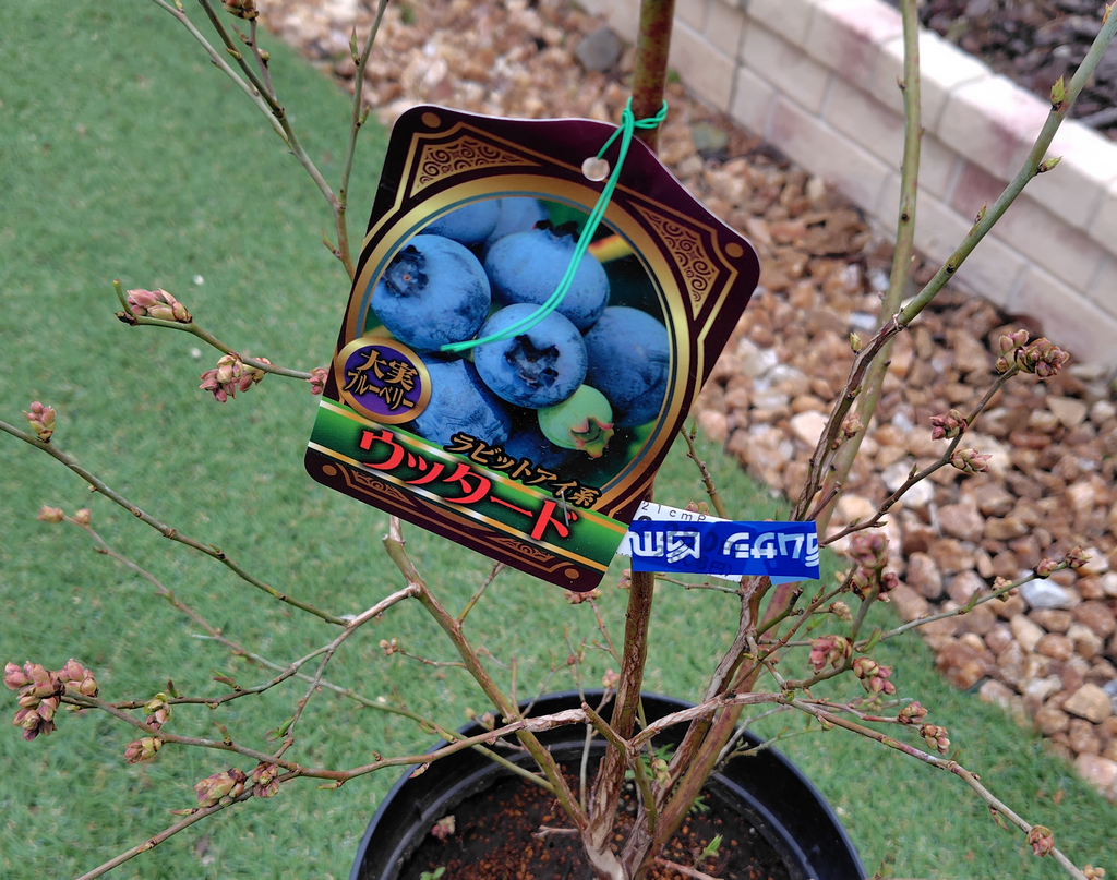 蕾を大量に付けたラビットアイ系の大実品種。同じ樹勢の他品種より30%ほど高価で収量や味に期待感があり、悩みに悩んで買ってしまった。