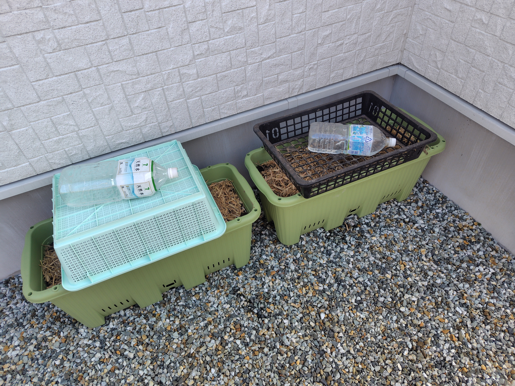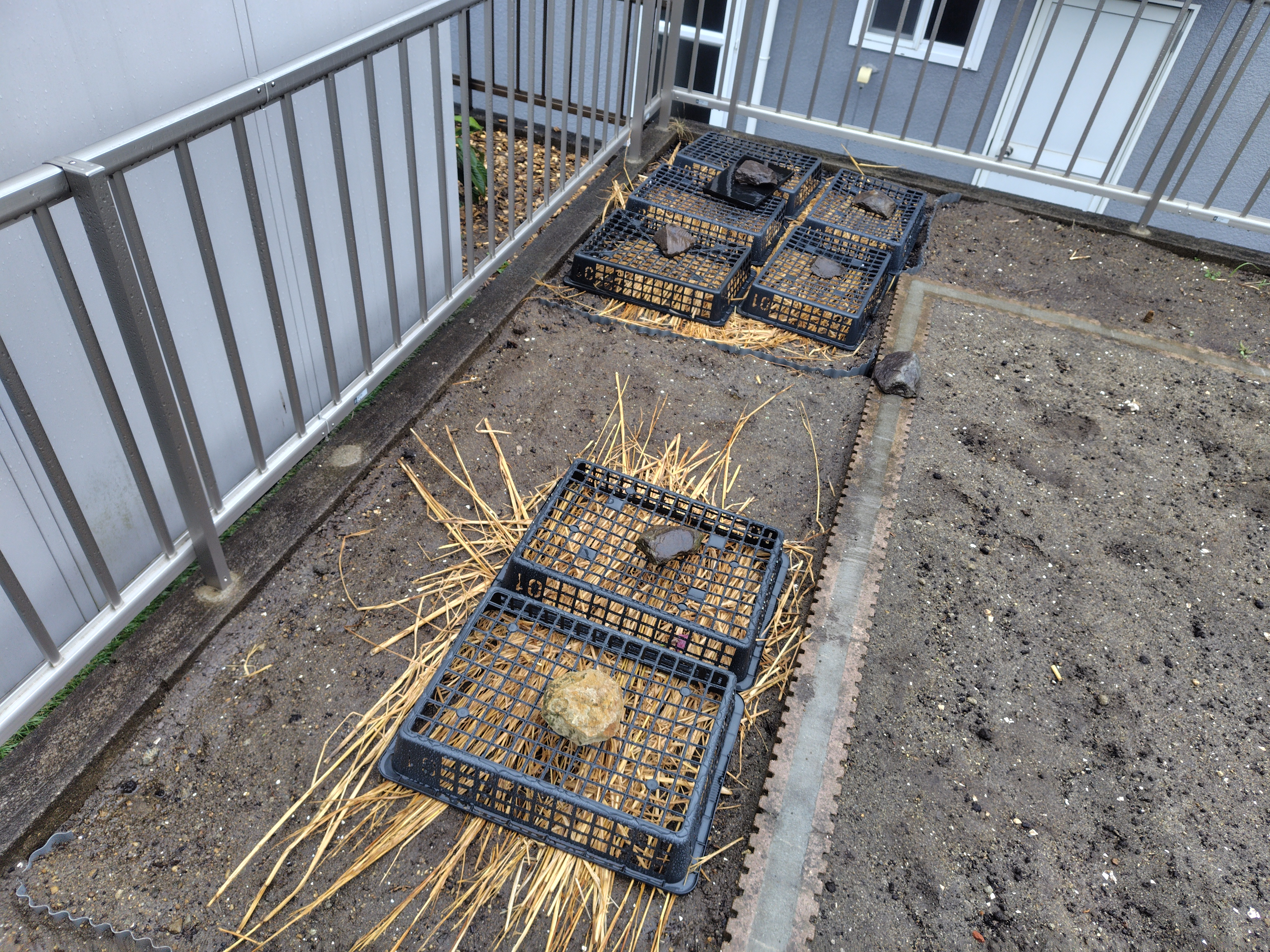 黒トレーは風飛び対策なんですが、芽が伸びてきたら撤去しなければならず、恒久的じゃないんですよね…。