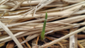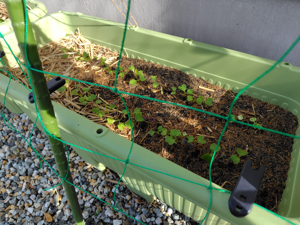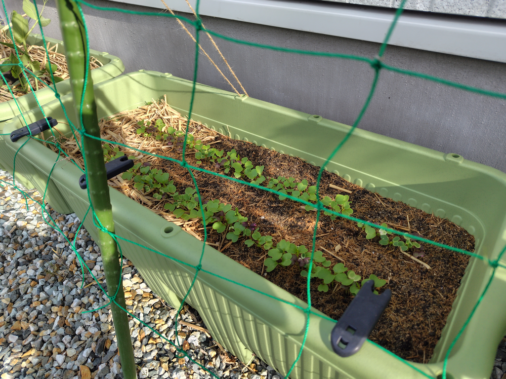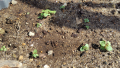 余談ですが、敷き藁は大半が吹き飛んでますね。土表面の乾燥防止が目的でしたが、細かくカットした藁なので、散水で湿らせても無力でした。長い藁を折り曲げて押し込み、石で押さえれば飛ばないのですが、ゴワゴワの藁が発芽を邪魔しそうです…。