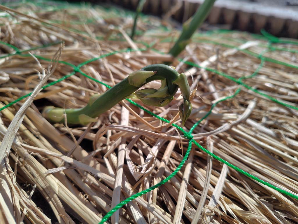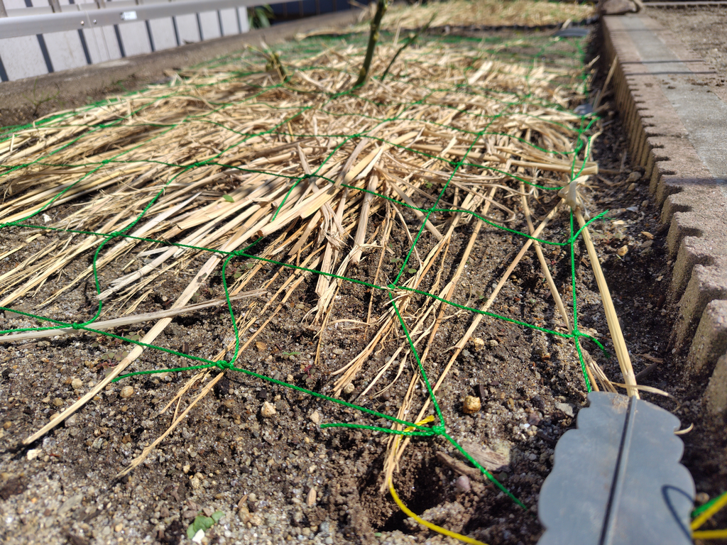 ミョウガとアスパラガスの敷き藁に、風飛び防止としてネットを設置しました。黒トレーに石を載せて押さえる方法だと、押さえる力が強過ぎて芽が変形するからです。