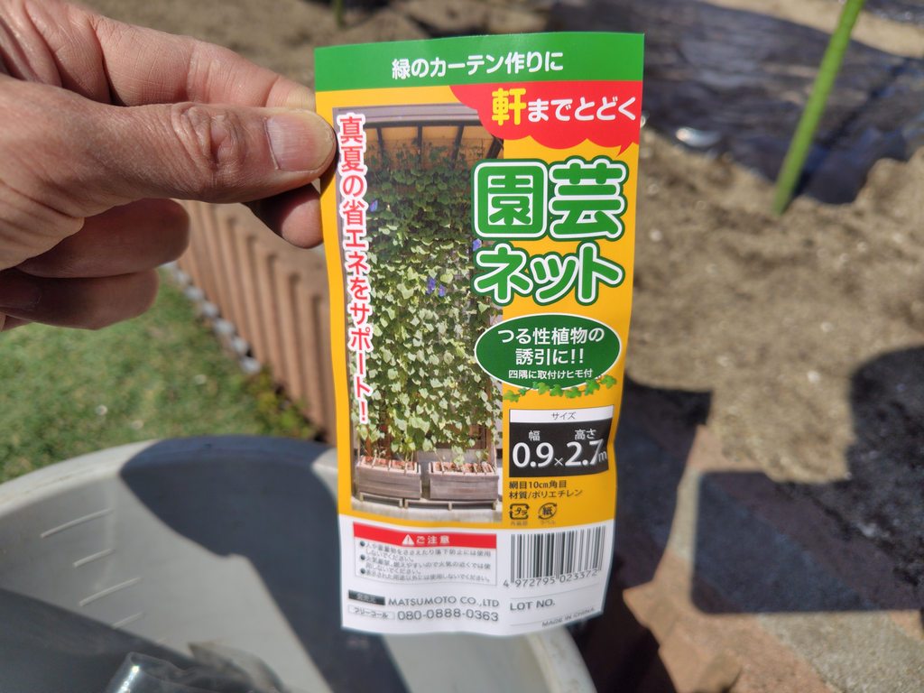 0.9m×2.7mの園芸ネットをハサミで2等分に切って、ミョウガとアスパラに設置しました。ネットの四隅は昔購入した「マルチ押さえ」を使用。