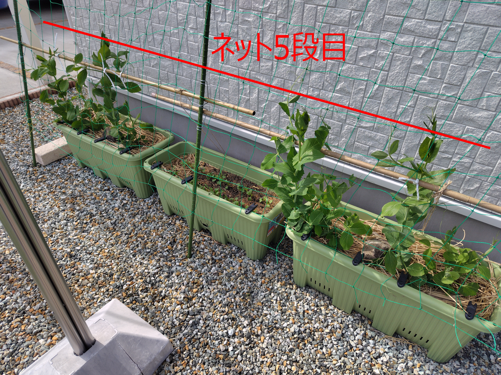 スナップエンドウがネットのマス5段目まで成長しました。
