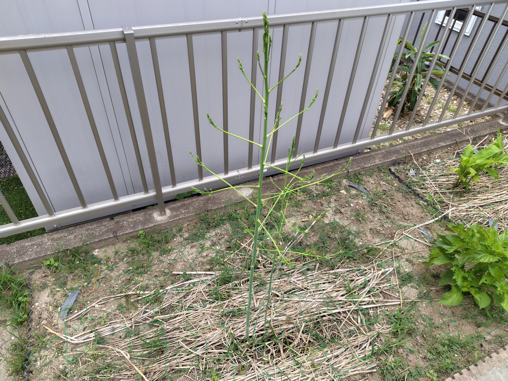 6/29 伸びた芽が1.5m近くなったと思ったら、根本から折れ曲がりました…。2本ともです。支柱を立てて固定し元に戻しましたが、アスパラって収穫せずに伸ばす場合、この手間をかけるものなのでしょうか?? 折れ曲がった状態で放置すればいいだけ??