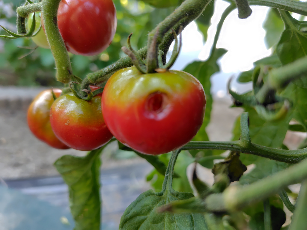 毎年恒例。今年もきましたミニトマトの虫食い。ガの幼虫の仕業です。実の周りにフンが付いてないので、実の中にはおらず食べることも出来そうですが、気持ち悪いですよね…。