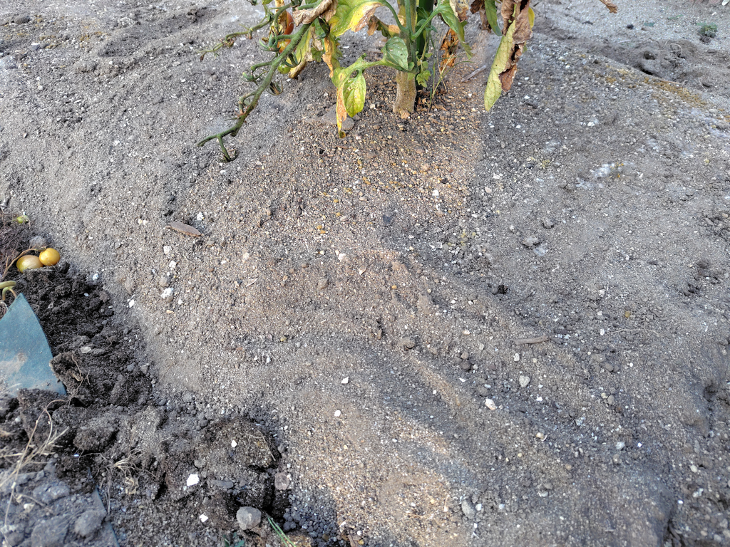また、追肥はマルチに入れた切れ込みから、土に化成肥料を撒き、かき回していますが、「砂場の土」のようにサラサラに乾燥していました。湿り気ゼロ。化成肥料が根に吸収されないことは明らかです。