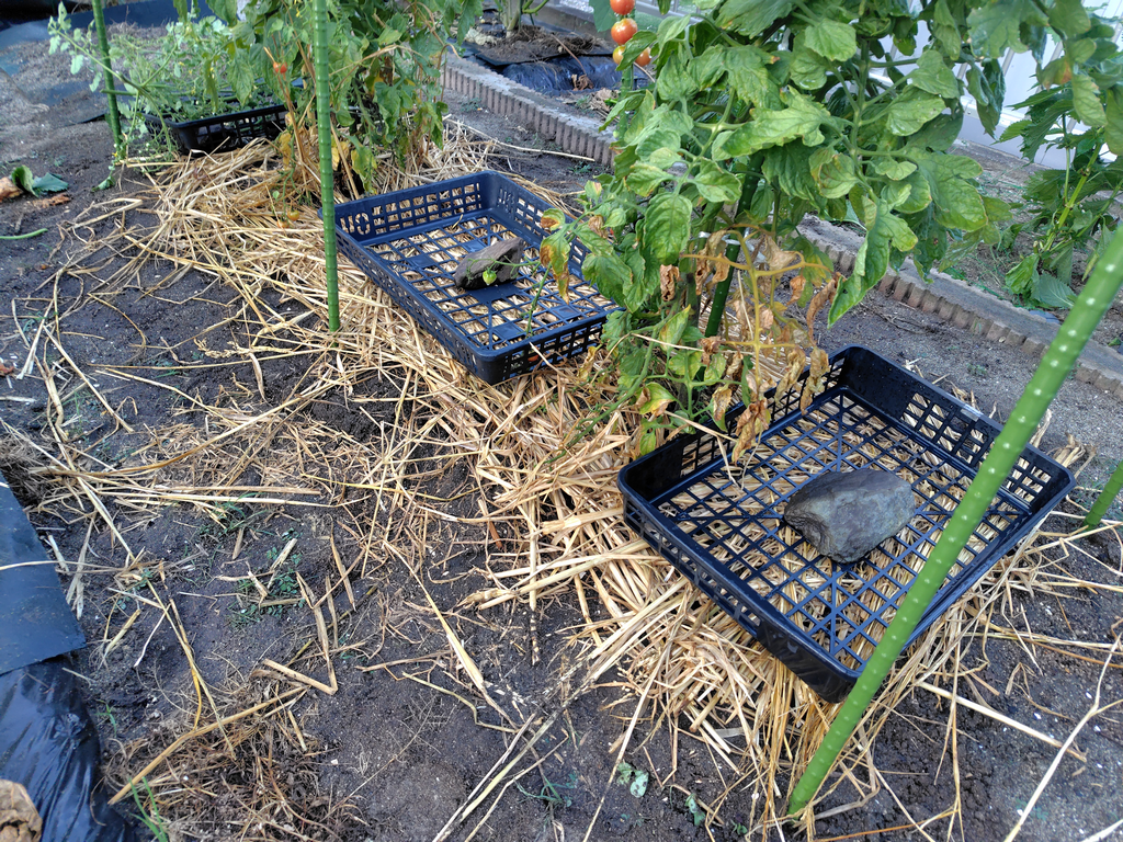 トマトの露地栽培は地中深く、広く、張り巡った根から水分を吸収できるのと、水分過剰だと実が「水っぽく」なるので、散水不要と言われますが、猛暑続きで水分が不足しているのではないか。