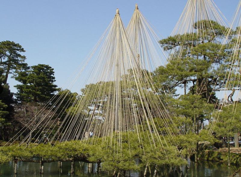 3日前に支柱追加したばかりですが、雨が降って枝がたわんだら、支え切れてない枝が何本も見つかりました💦 主枝じゃないしいいかと放置すると昨年のように折れるので、漏れなく効率的に支えたいと思った時に、金沢の雪吊りを思い出しました✨