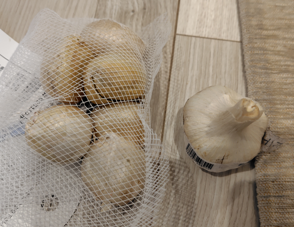 種ニンニクを買いに行ったところ「ジャンボにんにく」なる巨大種を発見! 「大きな柿」ほどの写真があり、こんなの見た事も食べた事もない!! と興味津々となって、これとホワイト六片の2種類を購入✨