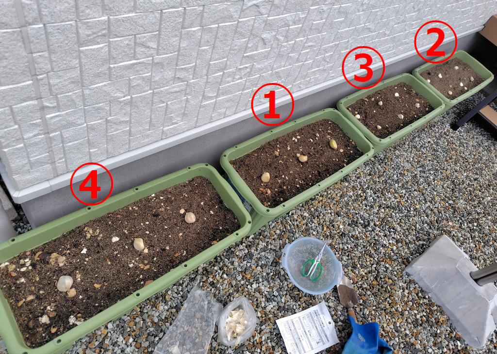 2行にして位置を少しずらしてます。プランタ壁との距離、ニンニク同士の距離がなるべく離れるように配置しました。