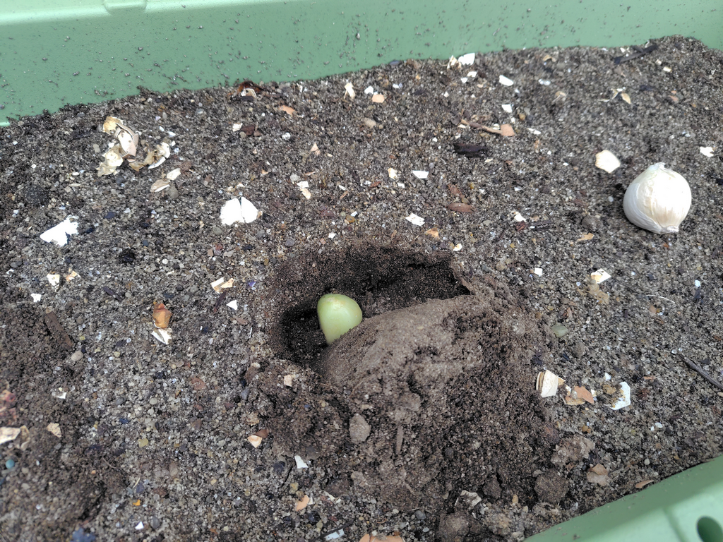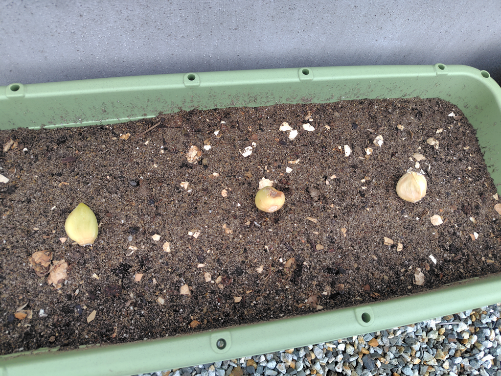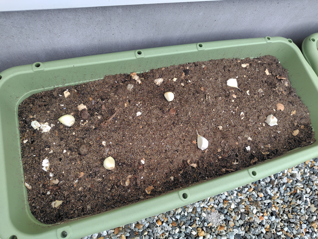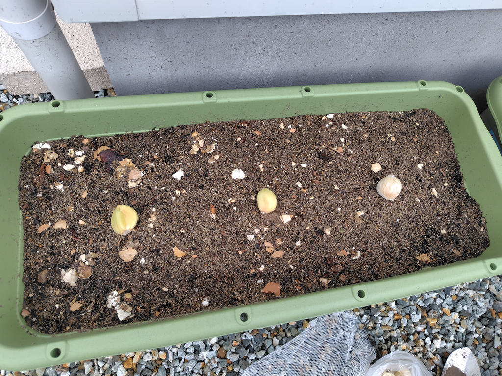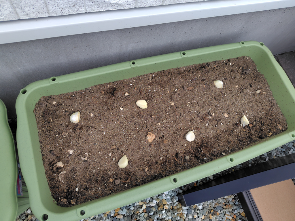空いてるプランタの次なる栽培はニンニクに決定。ラディッシュや葉物野菜などを検討したが結局「好きで有難みも大きい野菜」で決着^^