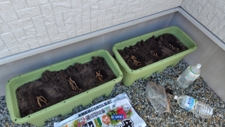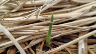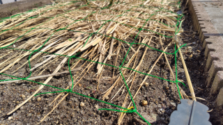 ミョウガとアスパラガスの敷き藁に、風飛び防止としてネットを設置しました。黒トレーに石を載せて押さえる方法だと、押さえる力が強過ぎて芽が変形するからです。変形したアスパラ。3本中、2本が変形しました。この後、頭を起こして真っすぐになるのかと思...